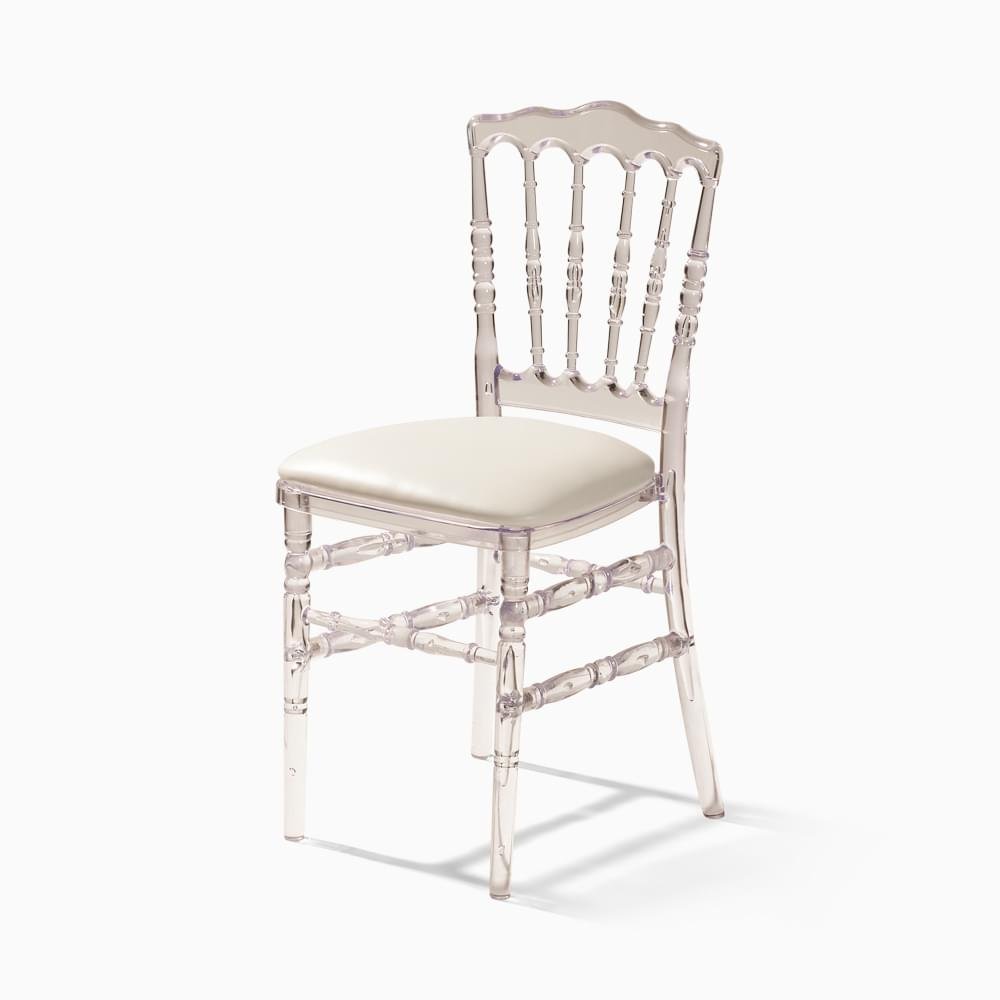 Location de chaises napoléons transparentes avec galettes d’assises.