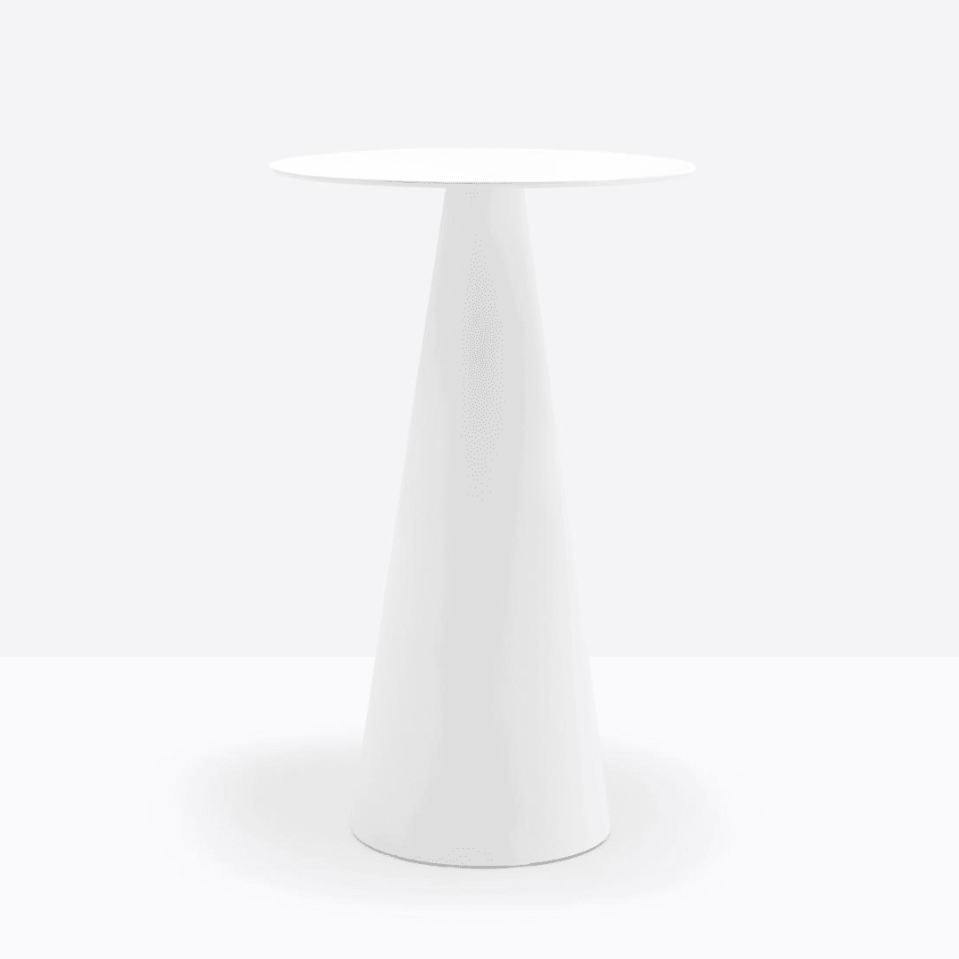 Table haute avec base conique en polyéthylène, qui peut être combinée avec des plateaux de différentes tailles et finitions.
